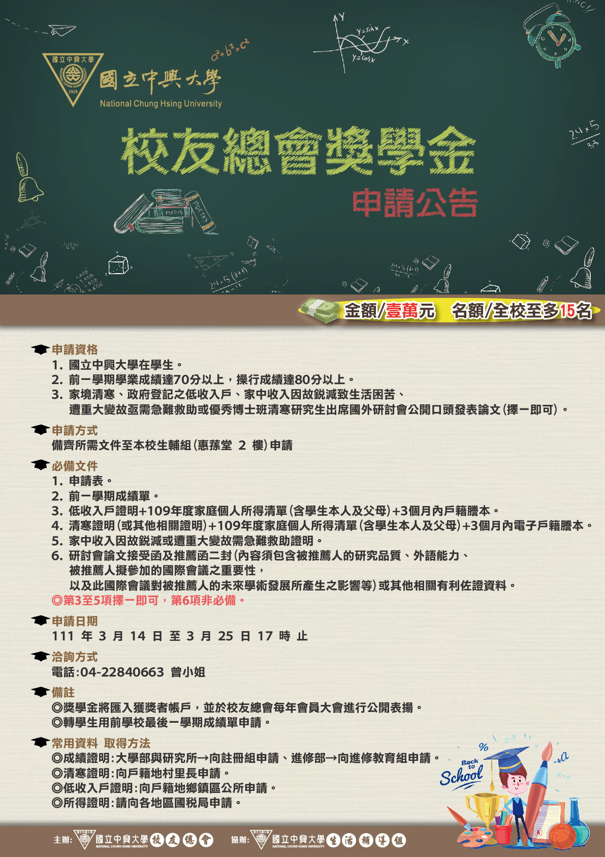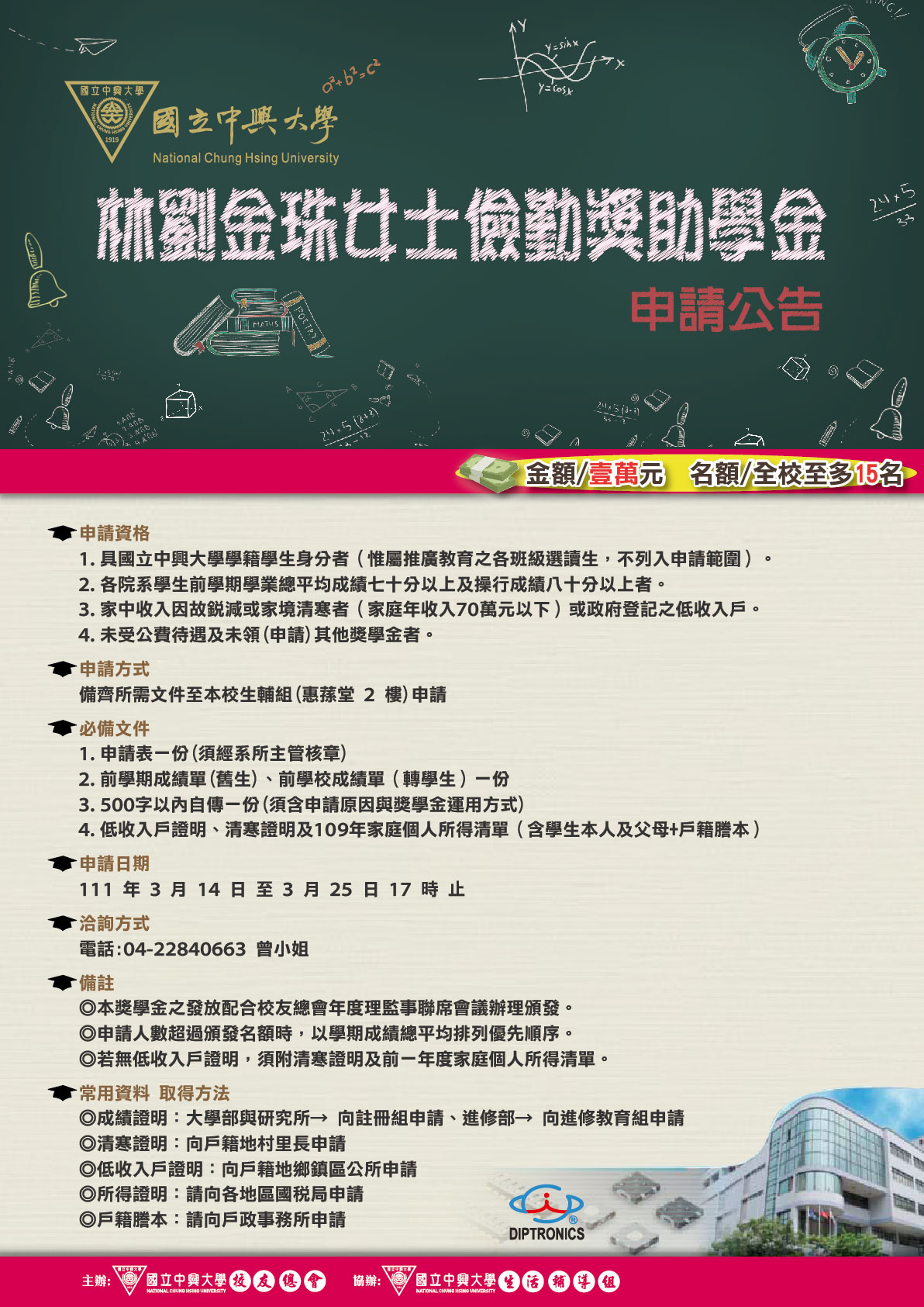 | 獎學金公告 | 110學年度第2學期獎助學金訊息 熱門 | 校友總會獎學金 林劉金珠女士儉勤獎助學金 中興大學獎學金一覽表